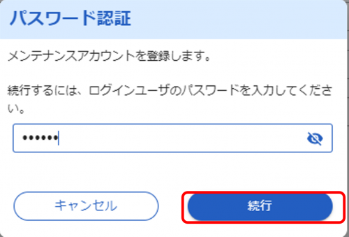 この設定のためにログインしたメンテナンスサイト用アカウントのパスワードを入力し、「続行」をクリックします。