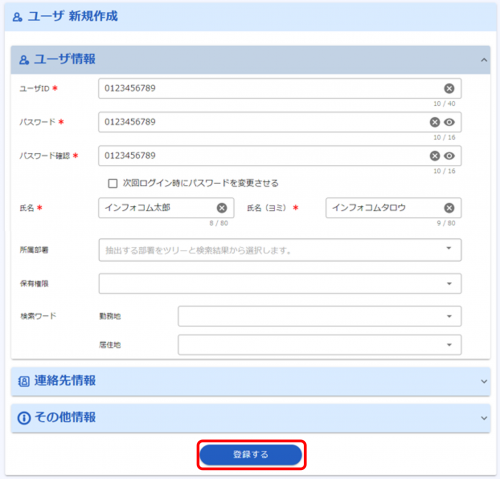 4. 新規ユーザの情報を入力し、「登録」ボタンをクリックします。