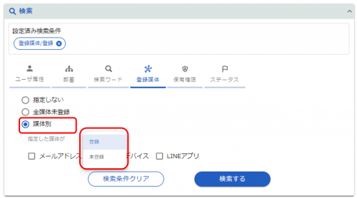 5. 「媒体別」を選択し、指定した媒体が「登録/未登録」かを選択します。