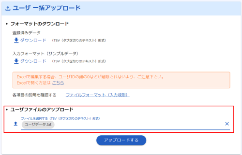 ※ユーザデータの各項目列は削除しないようお願いいたします。